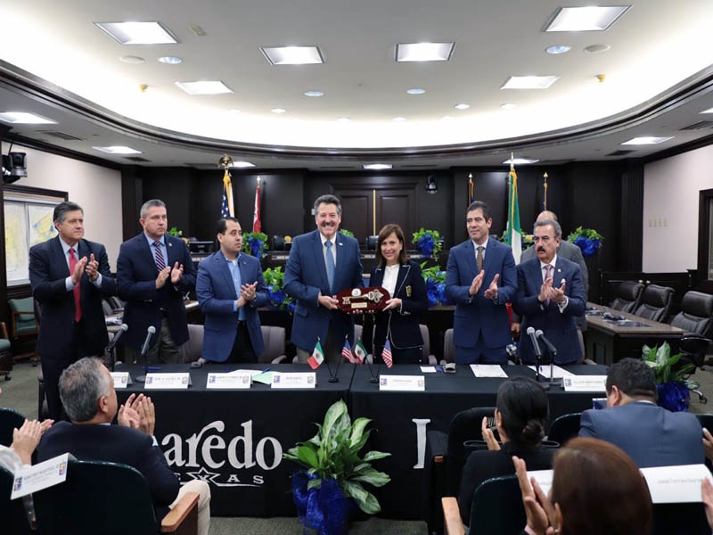 Monterrey,N.L. Como parte del refrendo de hermanamiento entre Guadalupe,N.L y Laredo Texas, la alcaldesa Cristina Díaz Salazar recibió de manos del Mayor Peter Saenz las llaves de la ciudad fronteriza.